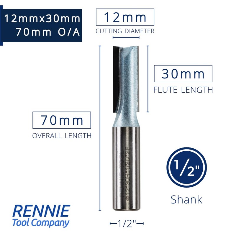Rennie Tools - 12mm Cutting Diameter x 30mm Flute x 1/2" Shank TCT Tipped 2 Flute Straight Router Cutter Bit. Compatible With Makita Trend Festool Hikoki Dewalt Router Etc. 12mm Router Bit