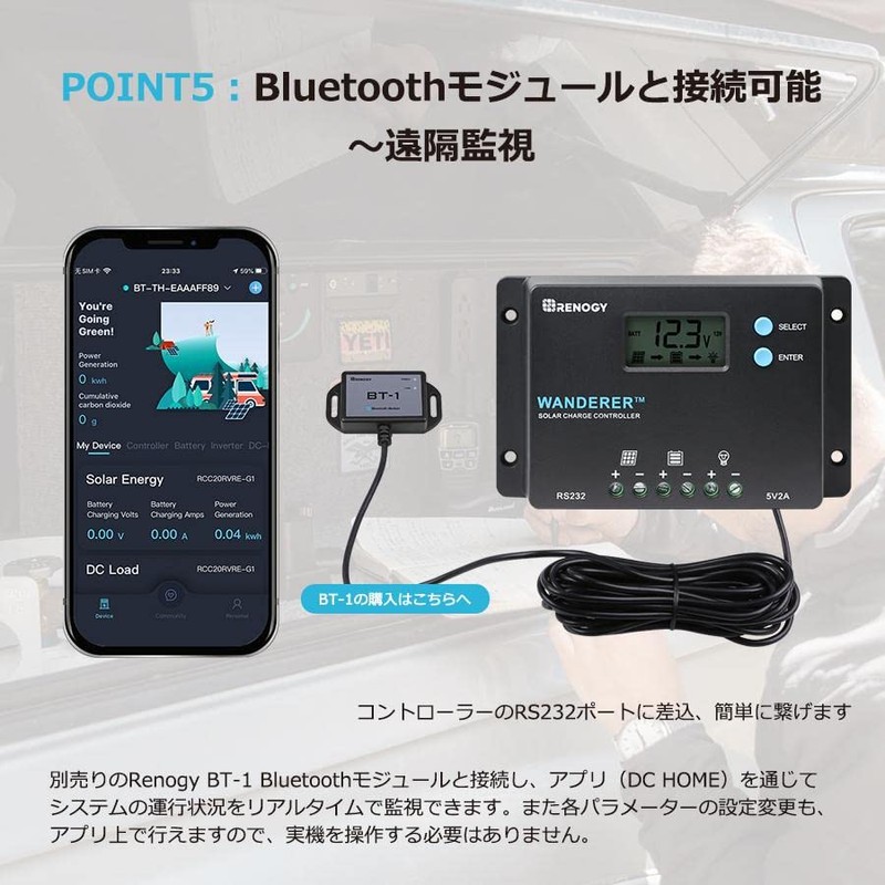 - Comes with a Japanese instruction manual (English language not guaranteed) The Renogy BT app will be completed on December 31, 2020. New APP will not be able to download after support is ended. You can continue to use the downloaded app, but we will not be able to support problems and operation, so we recommend using the DC HOME app that is supported in the future. We apologize for the inconvenience of customers who have already used the Renogy BT app. Thank you for your understanding