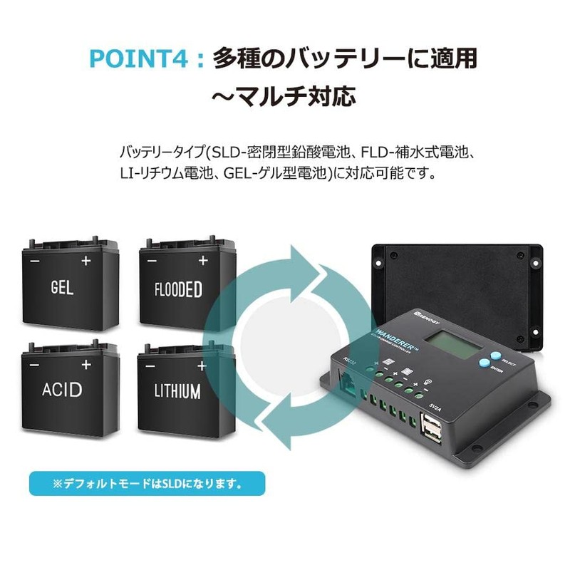 - 1. The PV input voltage can be charged with automatic recognition of 12V and 24V batteries up to "50V" (the total open voltage of the solar panel in series time). Can be used for 12V systems, up to 120W solar panels and 240W for 24V systems. (When charging the 24V battery bank, please use the solar panel in 2 rows. )