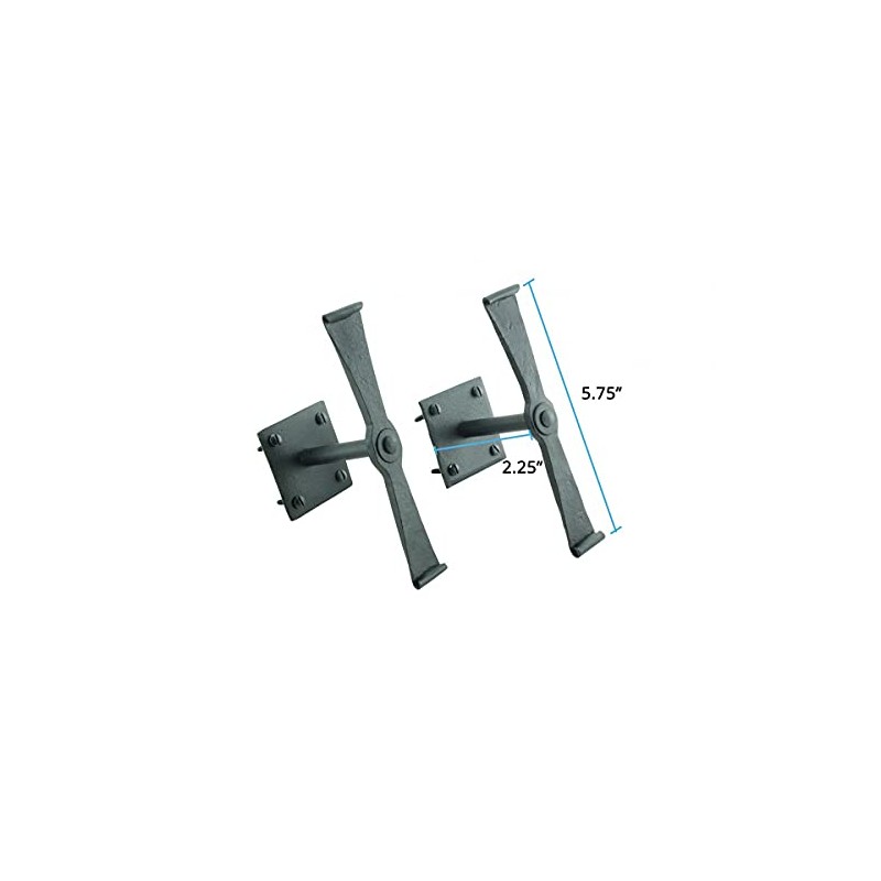 - SPECIFICATION - Color = Black, Material = Wrought Iron, Shape = Propeller, Total Length = 5.8 Inches, Projection = 2.25 Inches, Screw holes = 4. One set consists a pair of shutter dogs.