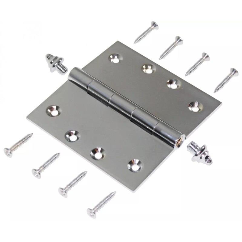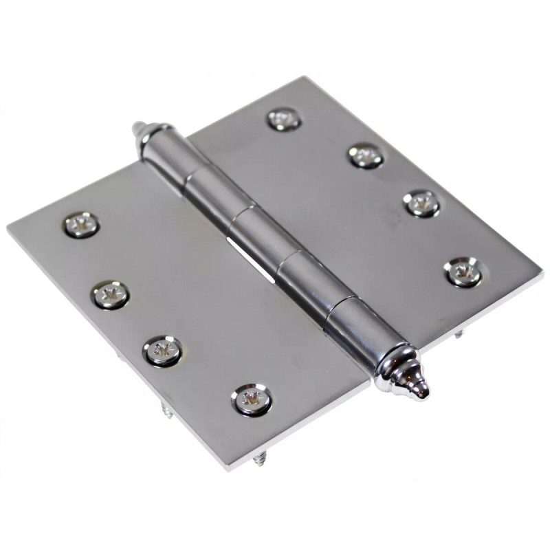 Door Hinges: This chrome-plated Solid Brass Door Hinge measures 4 in. x 4 in. Is solid brass extruded & precision CNC machined. It features 5 barrels, a non-binding stainless steel removable pin & interchangeable finials hinge built to ANSI standards.