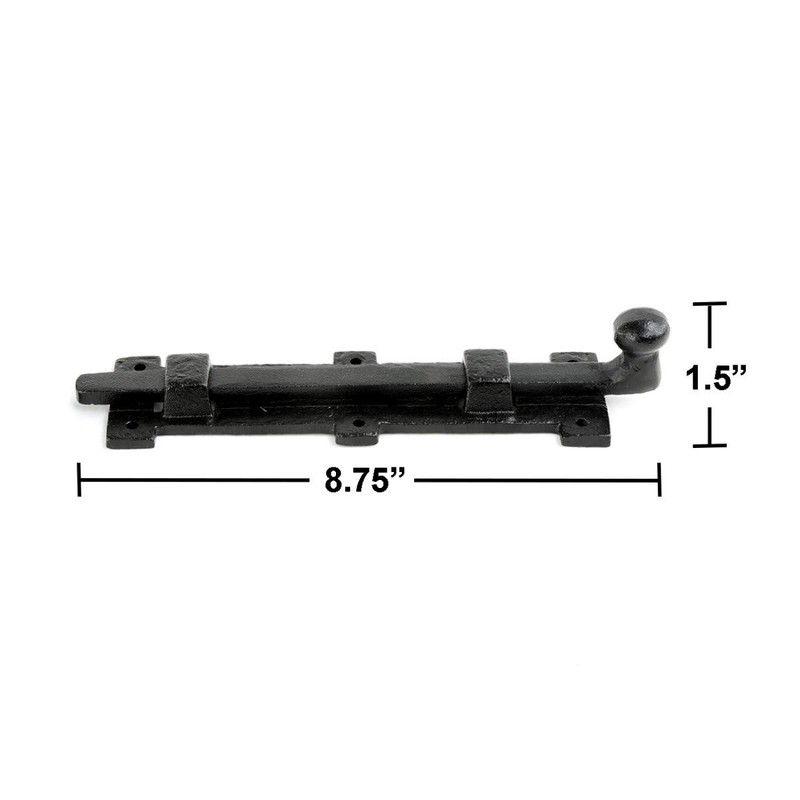 BLACK WROUGHT IRON BALL TIP STYLE SLIDING BOLT CABINET DOOR LATCHAchieve a casual yet timeless look with these beautiful Sliding Bolt Door Latch Locks. It can upgrade the look of your apartment and also provide extra security, privacy and stability for your cabinets, doors and windows. It has got wide applications like preventing children from opening doors or cabinets, others from suddenly breaking into the room, windows from being blown by the wind, and dogs from running out of the yard, etc.FEATURES - Constructed of sturdy wrought iron material - Protective Rust resistant black powder Finish - Can be used to prevent children from opening doors or cabinets - Can be fixed on Pet doors - Easy slide doors includes mounting hardware for hassle free installation - We recommend using different screws for external useSATISFACTION GUARANTEERenovators Supply Manufacturing offers you great value products for your money and a perfect way to spend wisely. We also provide 30 days guarantee with no fee.