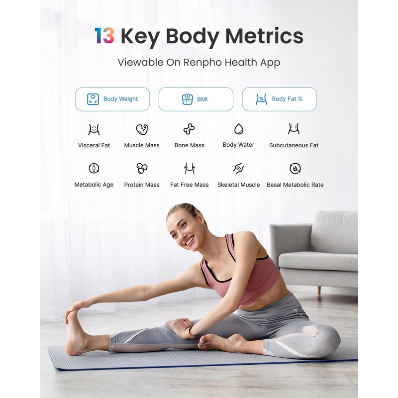 - [13 Key Fitness Metrics] This body fat scale provides comprehensive measurements, including body weight, BMI, body fat percentage, muscle mass, subcutaneous fat, fat-free body weight, visceral fat, body water, bone mass, protein, BMR, and metabolic age. Compatible with Apple Health, the Renpho Health app also syncs seamlessly with Samsung Health, Fitbit, and MyFitnessPal for a complete health overview