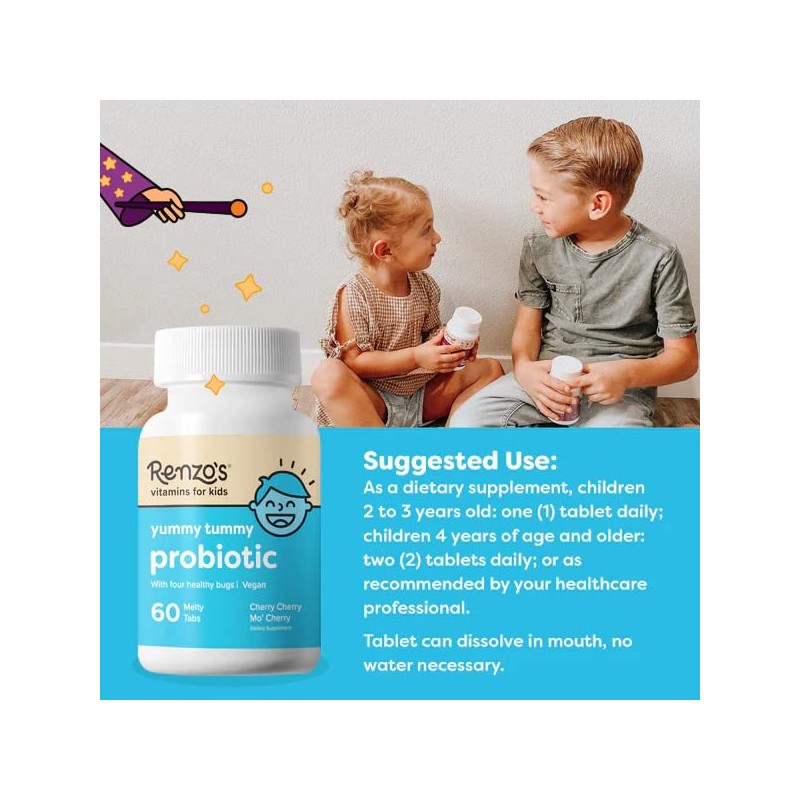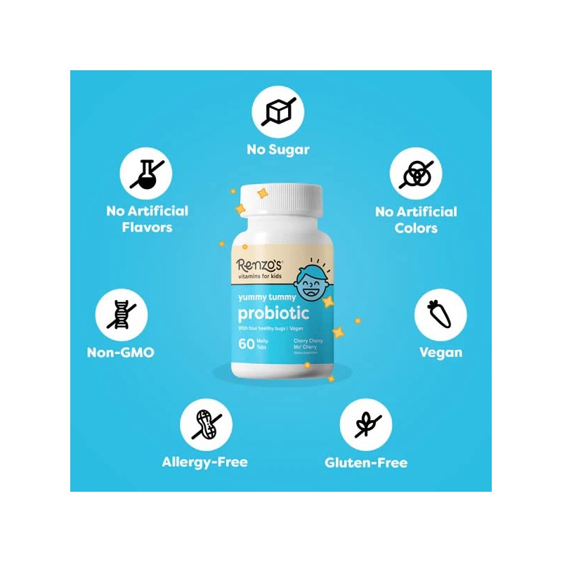 - GREAT TASTE FOR PICKY EATERS - Because Renzo's Yummy Tummy Probiotic for kids tastes great, your kids will look forward to taking their vitamins every day and you can ditch the hassle of bribing them to take a yucky gummy or liquid. Did we mention these are designed to melt in their mouth? They can also be chewed or dissolve nicely in water, juice, or a smoothie!