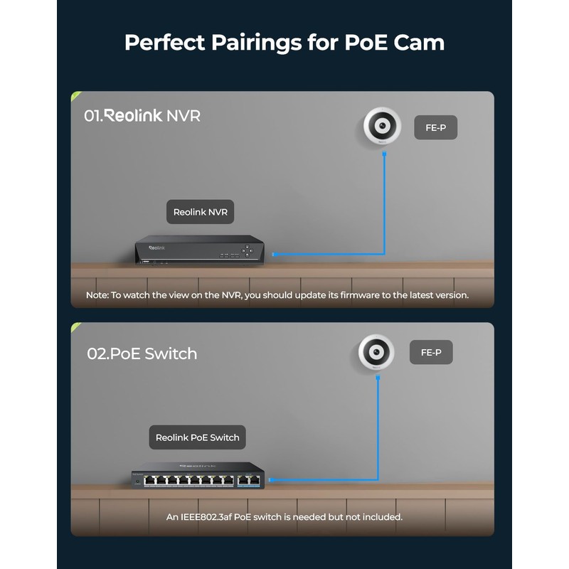 - POE SETUP & NVR Connection: Thanks to Power-over-Ethernet technology, a single Ethernet cable handles the data, sound, and power for the FE-P. Note: Reolink NVR models (N7MB01, N6MB01, N5MB01, H3MB18, N2MB02, and N3MB01) are supported with the latest firmware version. The DC power adapter is not included.