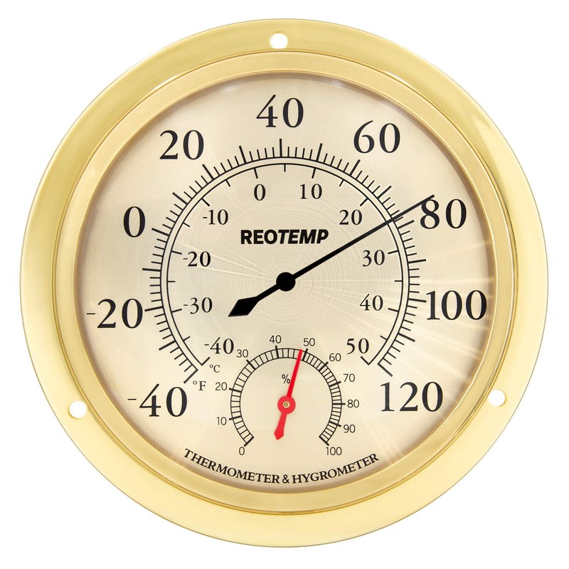 REOTEMP WTH6B Wall Thermometer Hygrometer, Analog, 5.75" Polished Metal Brass and Glass, Humidity and Temperature Monitor