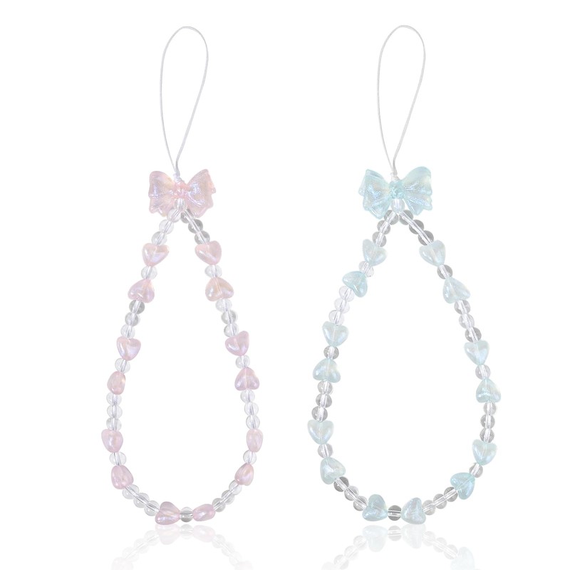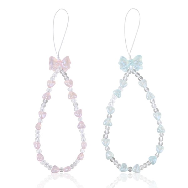 Reownest 2 Pack Phone Lanyard Charm Set - Cute Sparkling Crystal Bowknot Love Beaded Chain, Aesthetic Wrist Strap for Women Girls, Multi-Purpose Cellphone Bag Key Accessory - Blue,Pink