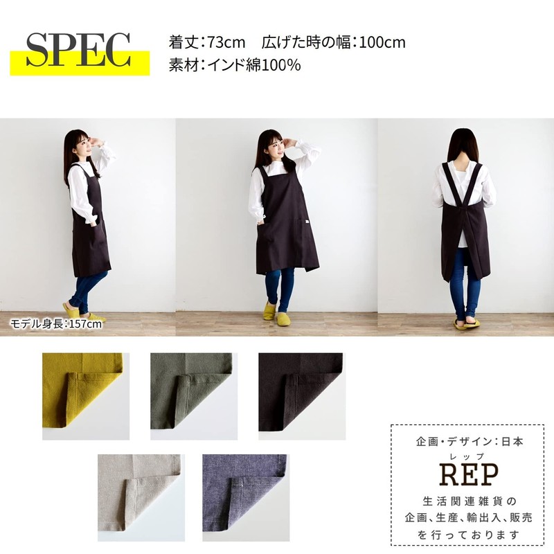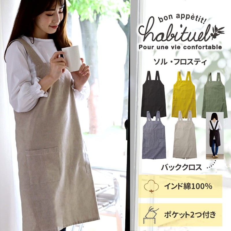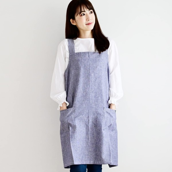 - Back cross type for easy wearing. This apron is made with chambray fabric woven with a different color of warp and weft, giving it a pale and relaxed impression