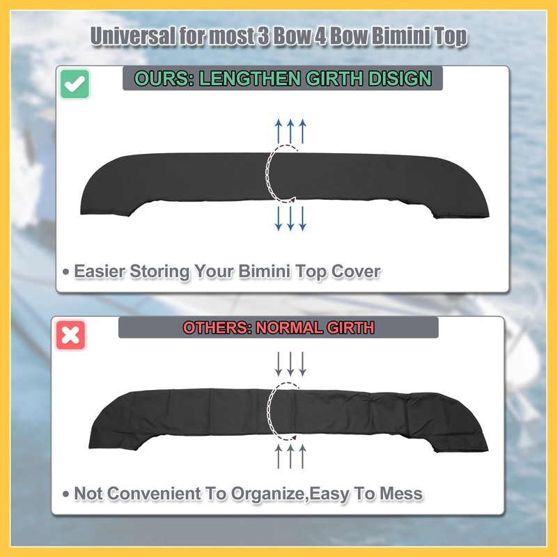 • Benefit: LENGTHEN BOOT CIRCUMFERENCE DESIGN: We add 1.2" girth specially for easier storing your bimini top canvas. Universal for most 4 Bow Bimini tops, Please measure your bimini top's folded circumference before buy.