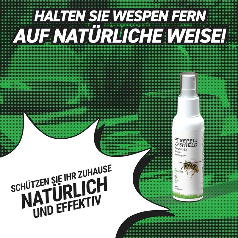 EFFEKTVES WESPENSPRAY FÜR ZUVERLÄSSIGE WESPENABWEHR - Lästige Wespen im Garten oder auf der Terrasse? Unser RepellShield Wespenspray bietet sofortigen Schutz gegen Wespen, Hornissen und Bienen – sanft, aber wirkungsvoll! Einfach sprühen und Wespen fernhalten.