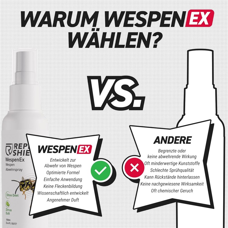 EFFEKTVES WESPENSPRAY FÜR ZUVERLÄSSIGE WESPENABWEHR - Lästige Wespen im Garten oder auf der Terrasse? Unser RepellShield Wespenspray bietet sofortigen Schutz gegen Wespen, Hornissen und Bienen – sanft, aber wirkungsvoll! Einfach sprühen und Wespen fernhalten.