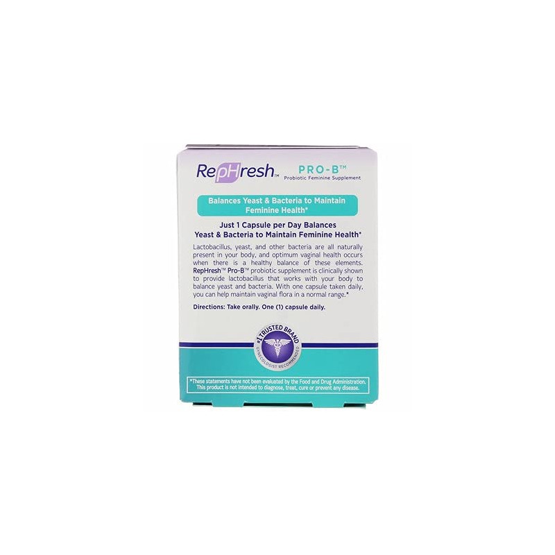 RepHresh Pro-B is a probiotic feminine supplement taken orally once daily to balance yeast and bacteria. Lactobacillus, yeast, and other bacteria are all naturally present in your body and optimum feminine health occurs when there is a healthy balance of these elements to support feminine health. RepHresh Pro-B feminine supplement contains patented and clinically tested strains of probiotic lactobacillus that have been shown to work with your body to balance yeast and bacteria. RepHresh Pro-B supplement lets you take control of your feminine health every day by helping to maintain flora in a normal range. RepHresh Pro-B is a natural supplement and comes in an easy-to-swallow capsule. RepHresh Pro-B is the #1 feminine probiotic supplement in the US in the latest 52 weeks ending 16 March 2016 according to The Nielsen Company data.