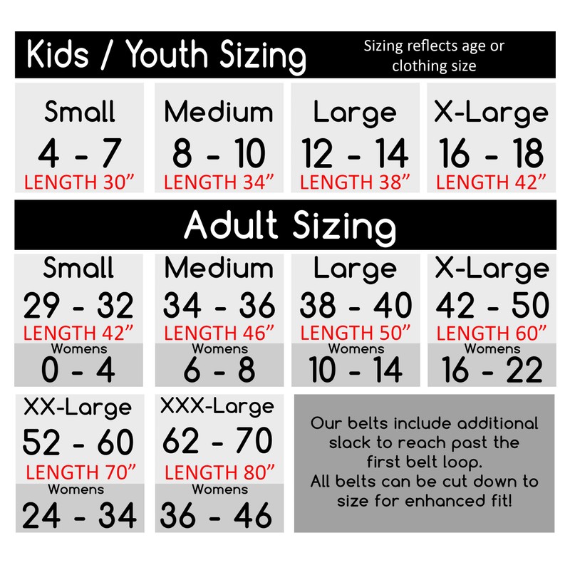 - FIRST: Select your desired size. Size chart can be found in the listing images. Total belt length is in "Red Font"