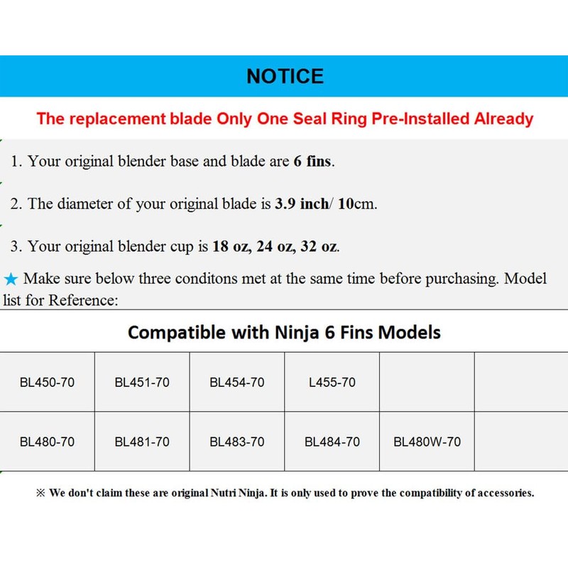 - Fits For: The 6 fins Blender Blade Replacement Part fits for 18 oz, 24 oz, 32 oz cup. Compatible with Nutri Ninja Blender Auto iQ 900W BL450-70, BL451-70, BL454-70, BL455-70, 1000W BL480-70, BL480W-70, BL481-70, BL483-70,BL484-70. Please confirm if your blender match the models mentioned above before purchasing
