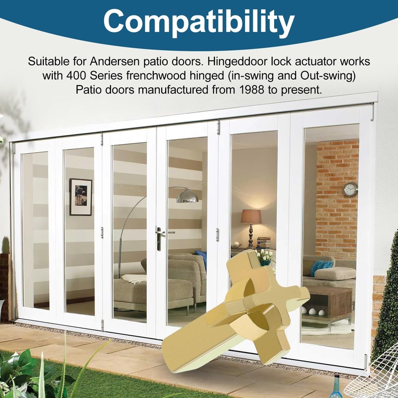 • Products: Replacement Andersen Hinged Door Lock Actuator 2579542, Our Andersen Hinged Door Lock Actuator for Andersen Frenchwood Hinged Inswing and Outswing Patio Doors and 200 400 A-Series Inswing Patio Doors is compatible with Andersen 200-Series Inswing Patio Doors, Andersen 400-Series Frenchwood Hinged Outswing Patio Doors, and A-Series Hinged Patio Doors.