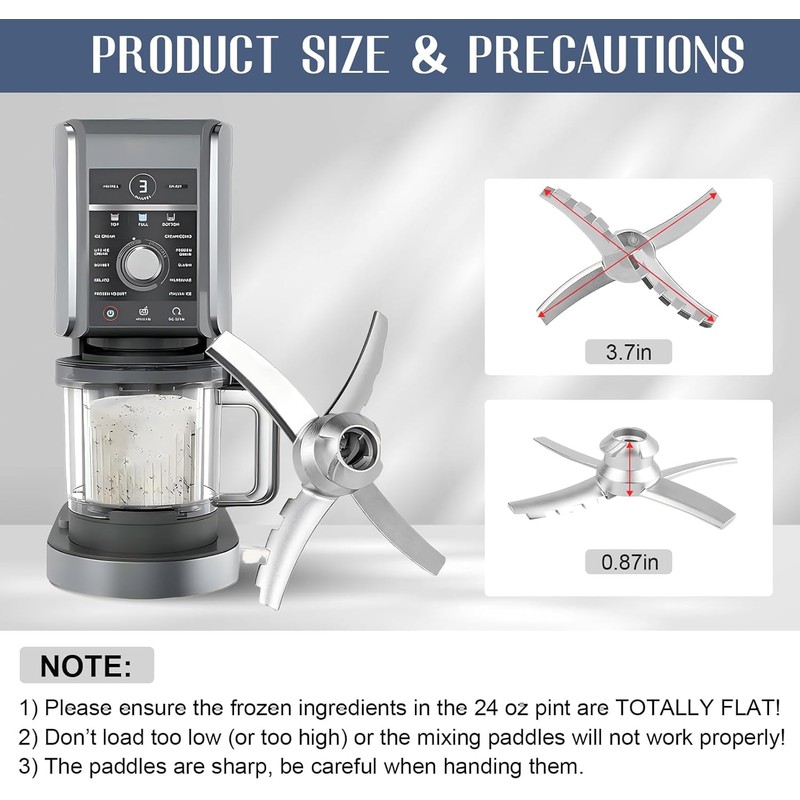 • Attention: 1) We do not claim that our replacement paddle part for Ninja Creamy is original; 2) This blade does not work with ice machines from Ninja Creamy (NC300 series) or Breeze (NC100/NC200 series); 3) Please make sure that the frozen ingredients in the cups are completely flat. If it is not flat, you can damage the blade and the cap may also fall off during mixing; 4) Do not fill the pints too low (or too high), otherwise the paddle will not work properly; 5) The blade is sharp, so be careful when handling it