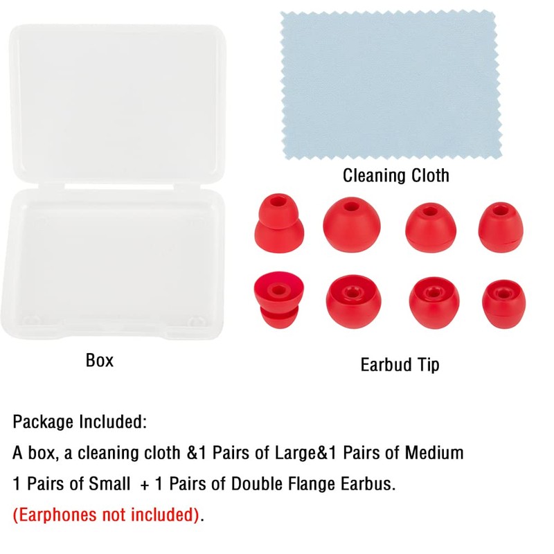 • 5.Package Included: A box, a cleaning cloth ,1 Pairs of Large + 1 Pairs of Medium + 1 Pairs of Small Earbuds + 1 Pairs of Double Flange Earbus(Earphones not included).