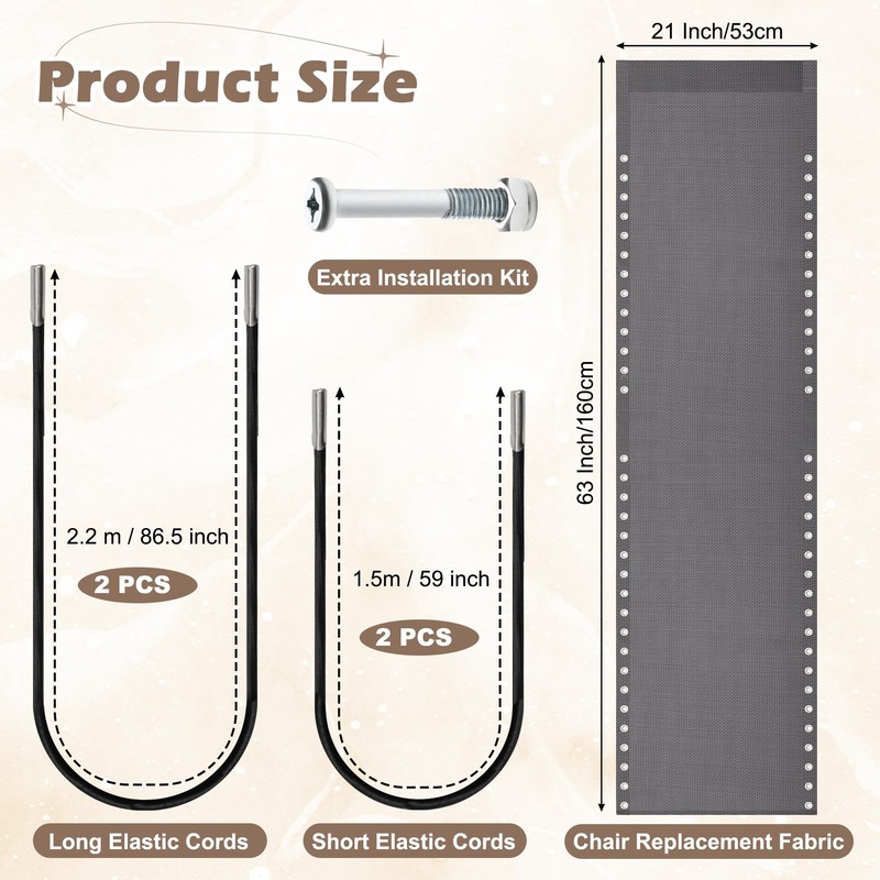 - 【Fit For Most Chairs】: The garden chair repair cords have two sizes, the short elastic cord is 59 inches/1.5m, the long elastic cord is 86.5 inches/2.2 m, diameter is 4.5mm. The chair replacement fabric is 21x63inch/53x160cm (W x H). Suitable for most chairs, such as sun loungers, lounge chairs, recliners, folding chairs, anti-gravity chairs
