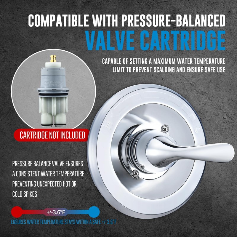 - TEMPERATURE LIMIT - Our pressure balanced valve cartridge maintains stable temperatures, preventing scald.