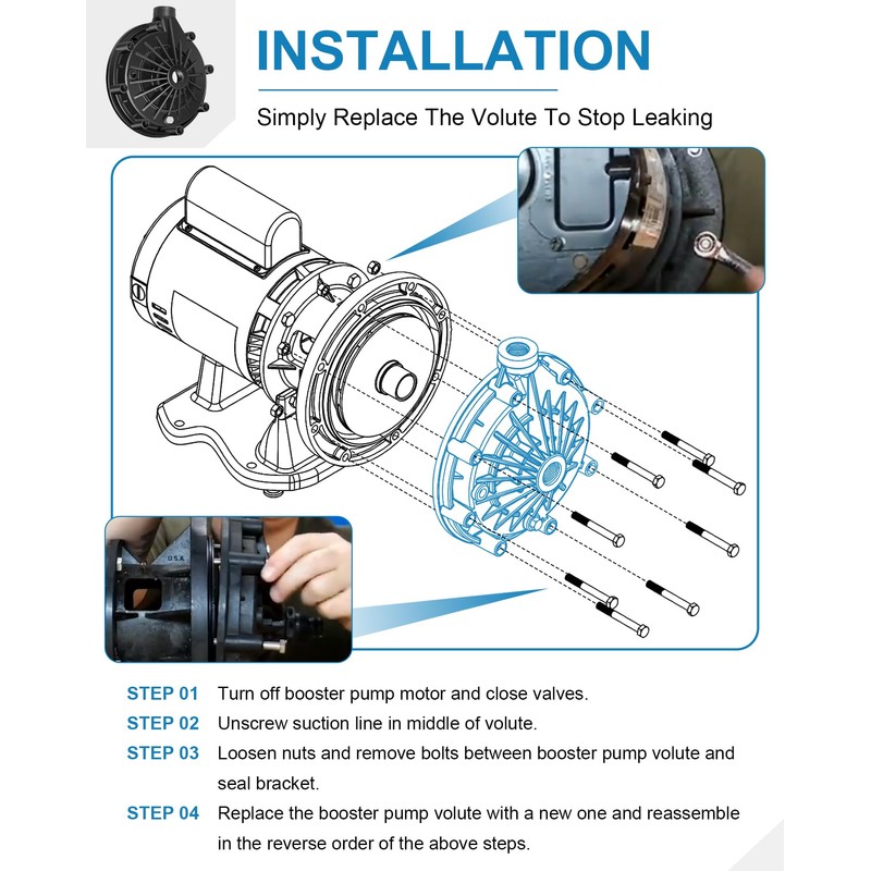 - 【Installation】Easy to Install. Make sure the power is disconnected to the pump before installation, turn off booster pump motor and close valves. Unscrew suction line in middle of volute. Loosen nuts and remove bolts between booster pump volute and seal bracket. Then simply replace the booster pump volute with a new one and reassemble in the reverse order of the above steps.