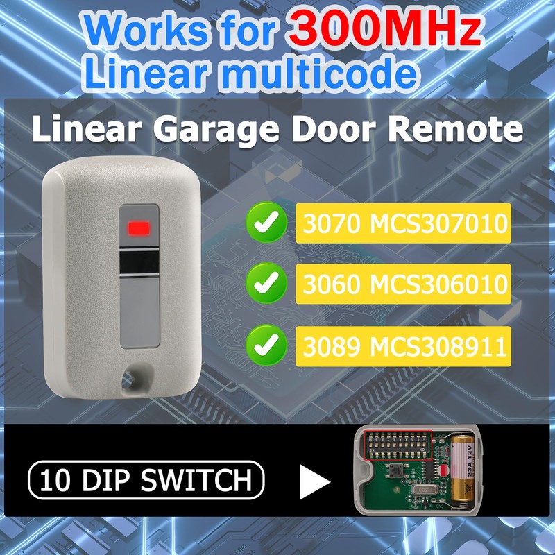 - 【COMPATIBILITY】: Works for 300MHz Linear multi code 3070 3089,3089-11, 4120,4140,3060,3083, keypad model 4200 or 4200-01; For Linear receivers: MCS307001,MCS308911, MCS412001, MCS414001, MCS306001, MCS308301,and MCS420001. Only works for 10 Dip Switch replacment, not for 8 or 9 dip switch remotes
