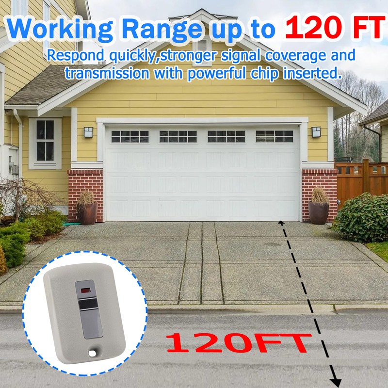 - 【WIDE WORKING RANGE】: This garage opener remote control features high-quality materials and the radio frequency technology with upgraded chip to realize good performance, the working range of up to 120 feet, respond immediately without issues