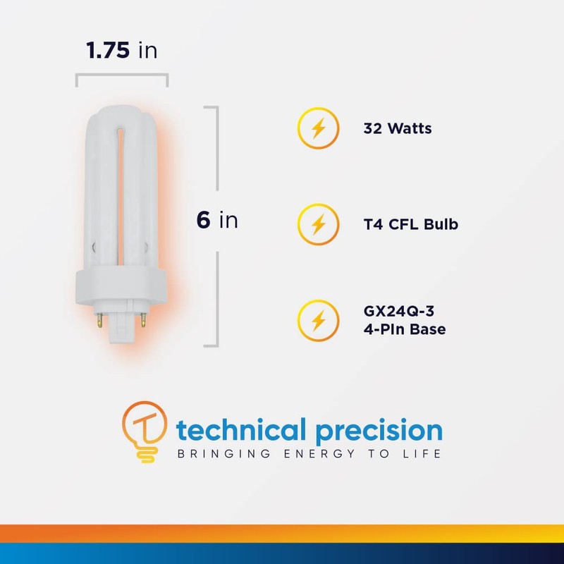 - Specification - 32-watt PLT triple tube CFL with GX23Q-3 4-pin base, 3500K neutral white light, 10000 hours average rated life, 2400 lumens, 6 inches L x 1.75 inches W - 1 pack.