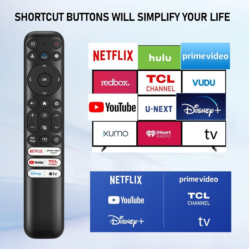 • 【6 Popular Shortcut Buttons】Replacement TCL remote control comes with 6 shortcut buttons - Netflix, Prime Video, YouTube, TCL Channel, Disney TV. Just use these shortcuts to jump directly to your favorite content. Save your search time and enjoy a wonderful leisure time faster.
