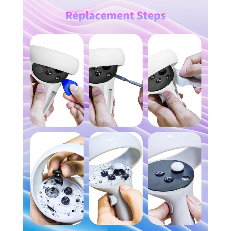 - 【9-in-1 Joysticks Replacement】Each replacement kit for Meta Quest 2 controllers contains all the necessary components and tools: 2 x Replacement thumsticks, 4 x Thumbstick Caps, 1 × Triangle Pry Tool, 1 × Pry Tool, 1 × Metal Pad Tool.
