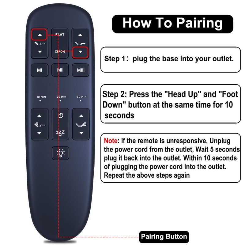 - Please Set Before Use: The remote is pre-programmed to the adjustable base, however if the remote is unresponsive, follow these steps: If the remote illuminates: Unplug the power cord from the outlet Wait 5 seconds plug it back into the outlet. Within 10 seconds of plugging the power cord into the outlet: Press the "Head Up" and "Foot Down" button at the same time for 10 seconds, the adjustable base will be-paired with the remote.(Check the batteries; replace if needed)
