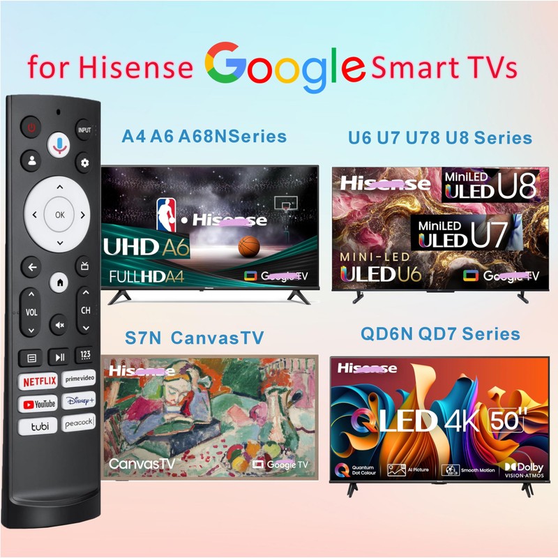 Universal Compatibility with Hisense & Google Smart TVs (Support Voice) Enjoy seamless integration with a wide range of Hisense and Google TV models, including: ✅ A4 Series: 32A4K, 40A4K, 43A4K ✅ A6/A68N Series: 43A6H, 50A6H, 55A6H, 65A6H, 70A6H, 75A6H ✅ U Series: 65U6K, 75U6K, 55U6N, 65U6N, 75U6N, 85U6N, 55U7N, 65U7N, 75U7N, 85U7N, 55U8N, 65U8N, 75U8N, 85U8N ✅ QD Series: 65QD7N, 75QD7N, 85QD7N, 43QD6N, 50QD6N, 55QD6N, 65QD6N, 75QD6N, 89QD6N, 100QD6N ✅ S7N CanvasTV Series: 55S7N, 65S7N ✅ Laser TVs: PX1, L5, L9 ✅ ERF3M90H Models: Fully tested and optimized for reliability