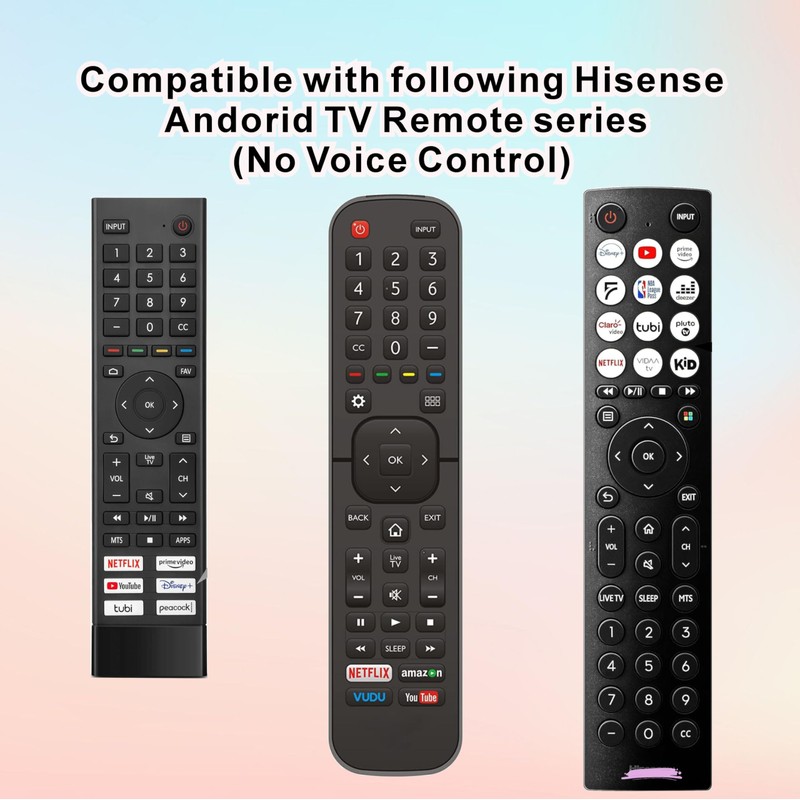• ✅ Universal Hisense TV Compatibility: 1. Android TV Models: U7G, U8, U9G, A45H, A4H, A6G, U6G/U68G/ VIDAA (32A4KV, 40A4KV, 43A4KV ) 2. For Hinsense TV remote models: ERF2K60H, ERF3J80H, EN2G27, EN3T39H, ERF2G60H, ERF3A90, 40H5D1 3. Auto-detects Android TV system, no programming required 4. No voice control in this mode – ideal for basic remote functions. (No Voice Control for these modesl, Directly Use)