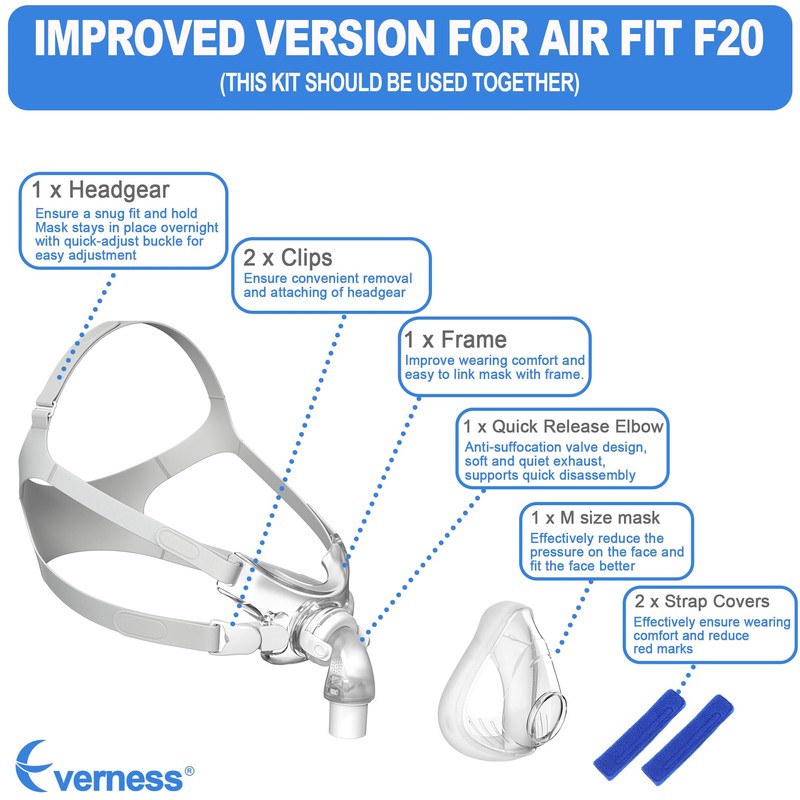- GREAT-VALUE REPLACEMENT SET - Great value but still work great replacement set supplies by Everness. Includes cushion (medium), headgear, elbow, frame and clips you need for Air Fit F20 in one pack.