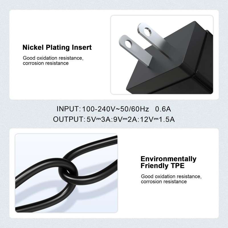 - Versatile Power Output: Multiple output options (5V/3.5A, 9V/2A, 12V/1.5A) provide efficient charging for a wide range of devices, while the input range (100-240V) ensures compatibility worldwide