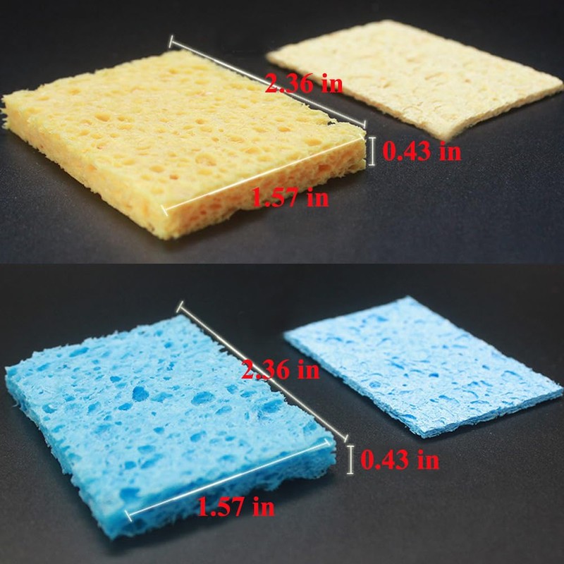 - 【Package Content & Size】 - 30pcs soldering iron cleaning sponge ( 15pcs yellow + 15pcs blue). Length: 60mm/2.36", Width: 40mm/1.57", Height: 11mm/0.43"