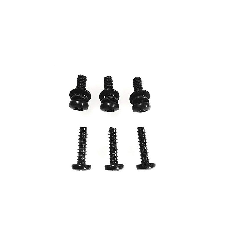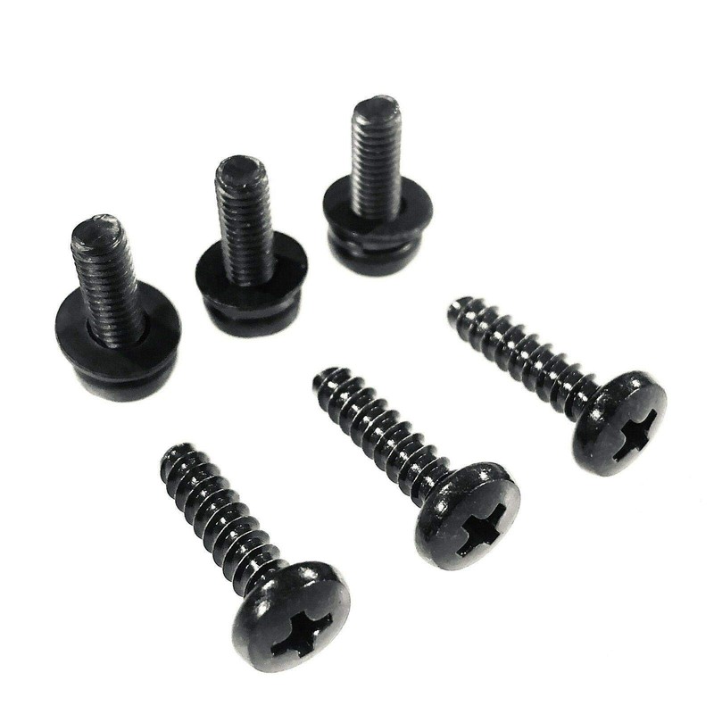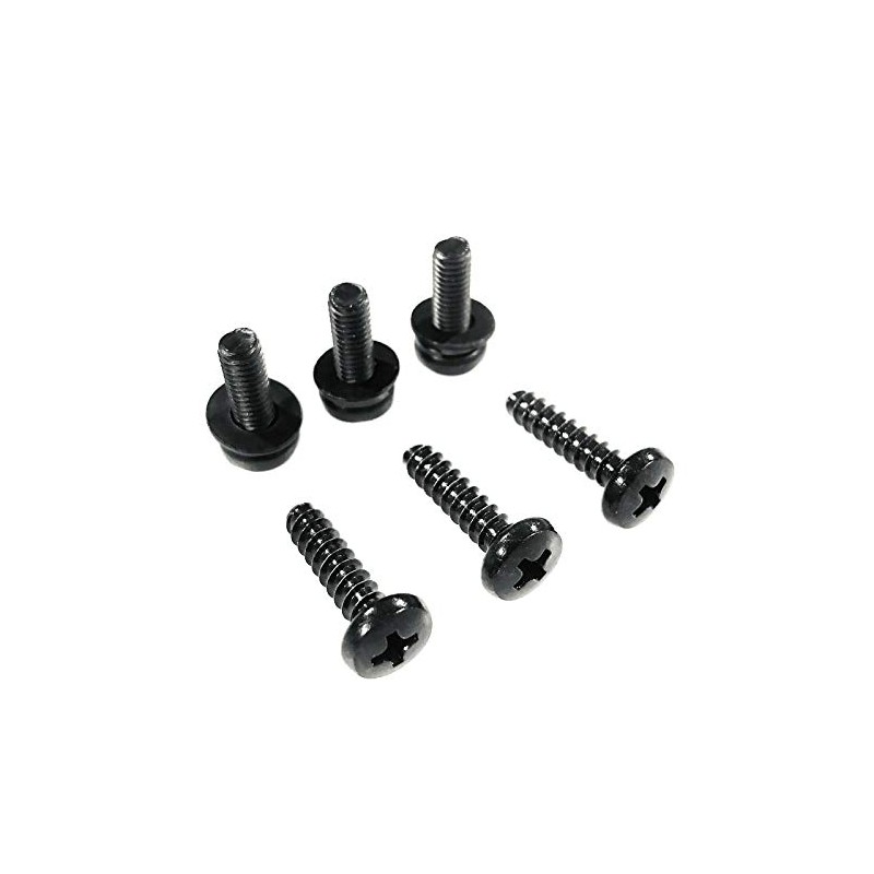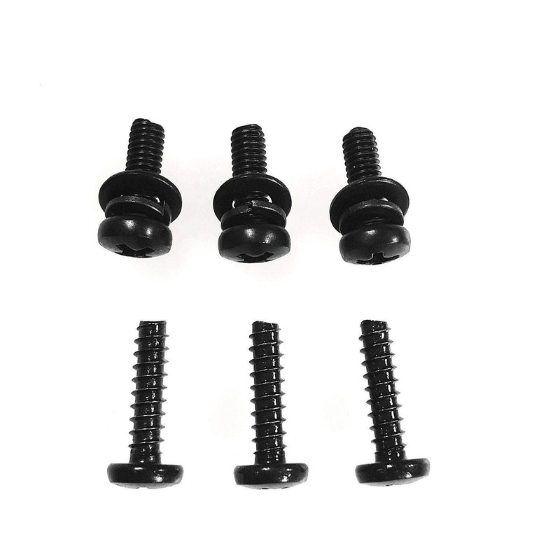 A complete set of TV stand replacement screws for your Vizio E320-B1. Two sets of metric screws, six screws in total. Three short black machine screws and three long black self-tapping screws.