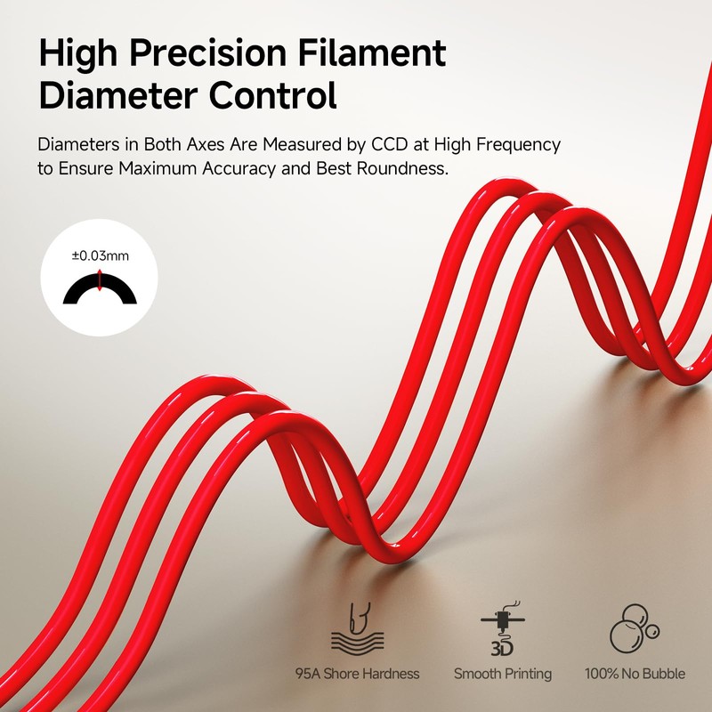 - 【Flexible Filament ——95A Hardness】—— Our TPU 1.75mm is highly flexible & elasti. Its excellent bed adhesion, low deformation, and minimal odor make it ideal for printing elastic models such as shoe insoles, phone cases, wearable devices, prosthetics, and more. Dry 50-60℃ for 6 - 8 hours before printing each time to achieve optimal results. These flexible settings cater to your unique printing needs.