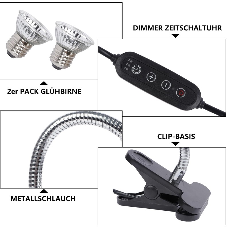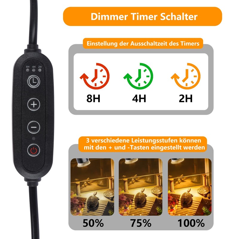 - 【Temperature Control & Timer】: the switches of this heat lamp can adjust the brightness and temperature, you can also adjust the distance of the heat lamp head to meet the needs of the reptile at different times.