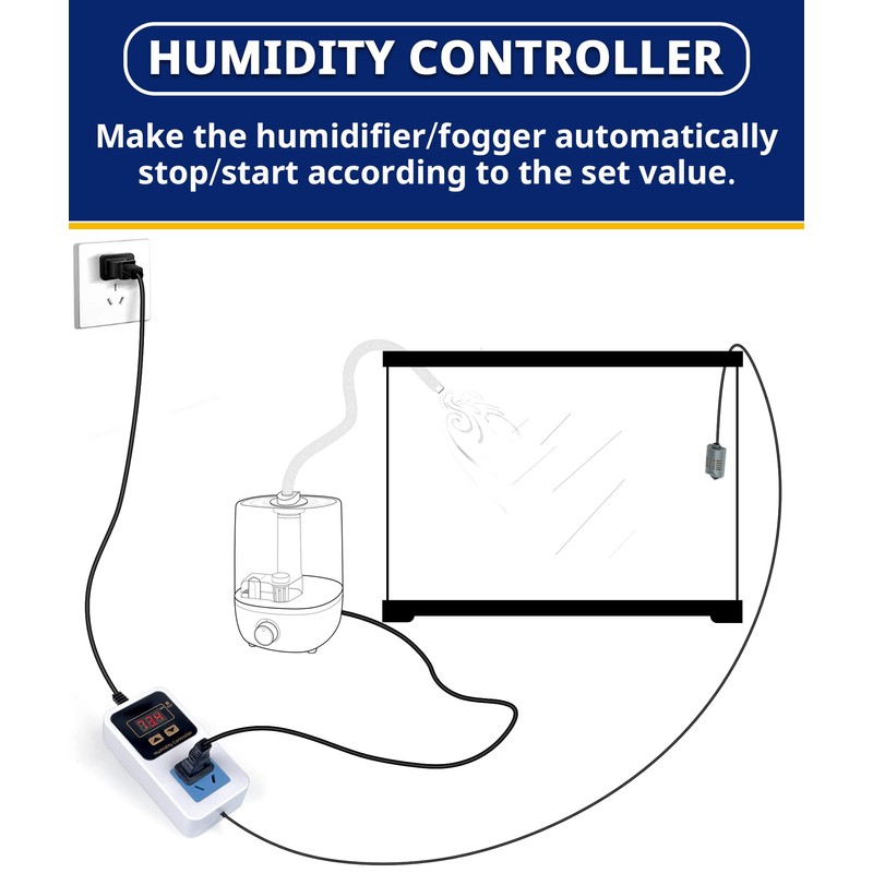 - 【How Does the Humidity Controller Work】 The humidity sensor measures the ambient humidity and the controller determine whether the reptile fogger runs or stops based on the preset humidity value, and then powers up or power cut the reptile fogger.