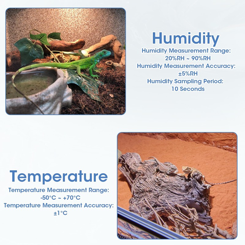 - High Measurement Accuracy: Reptile Terrarium Thermometer ensures precise readings with a temperature accuracy of ±1℃ (±2℉) and humidity accuracy of ±5% RH, providing reliability in maintaining optimal conditions.