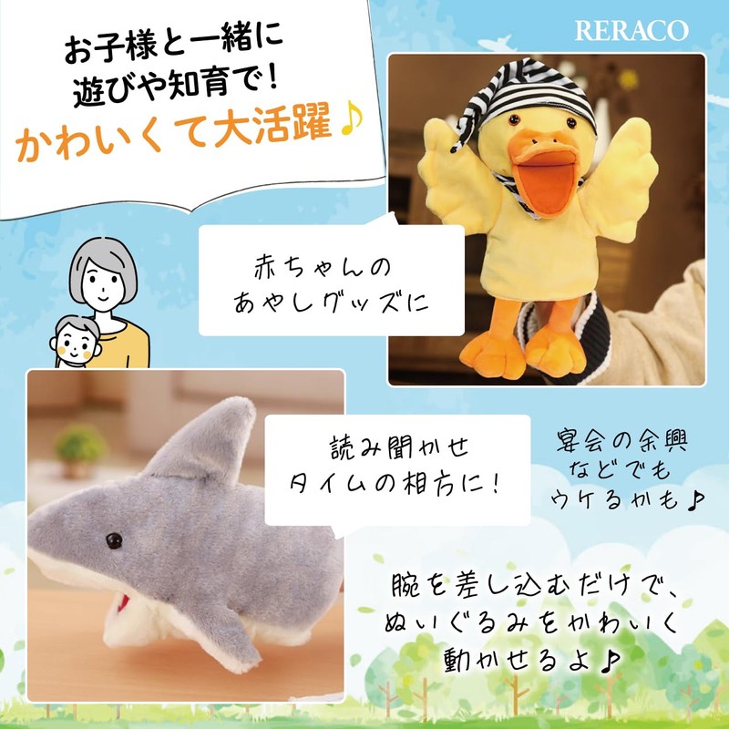 - Animal Hand Puppets: These plush toys feature shark, pig, dinosaur, duck, and dancing mouth