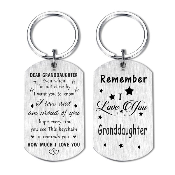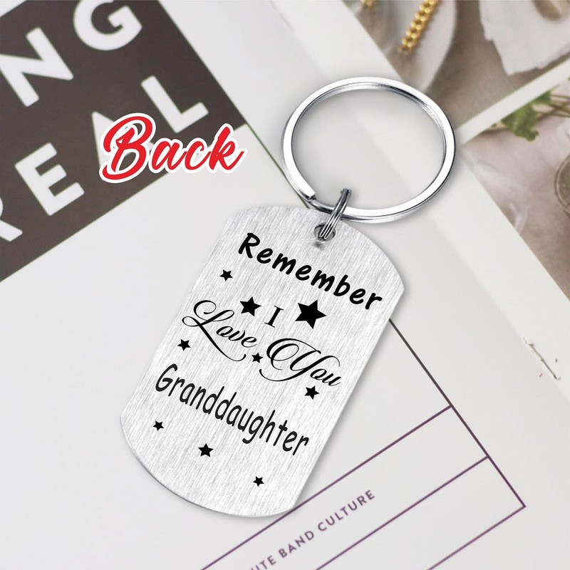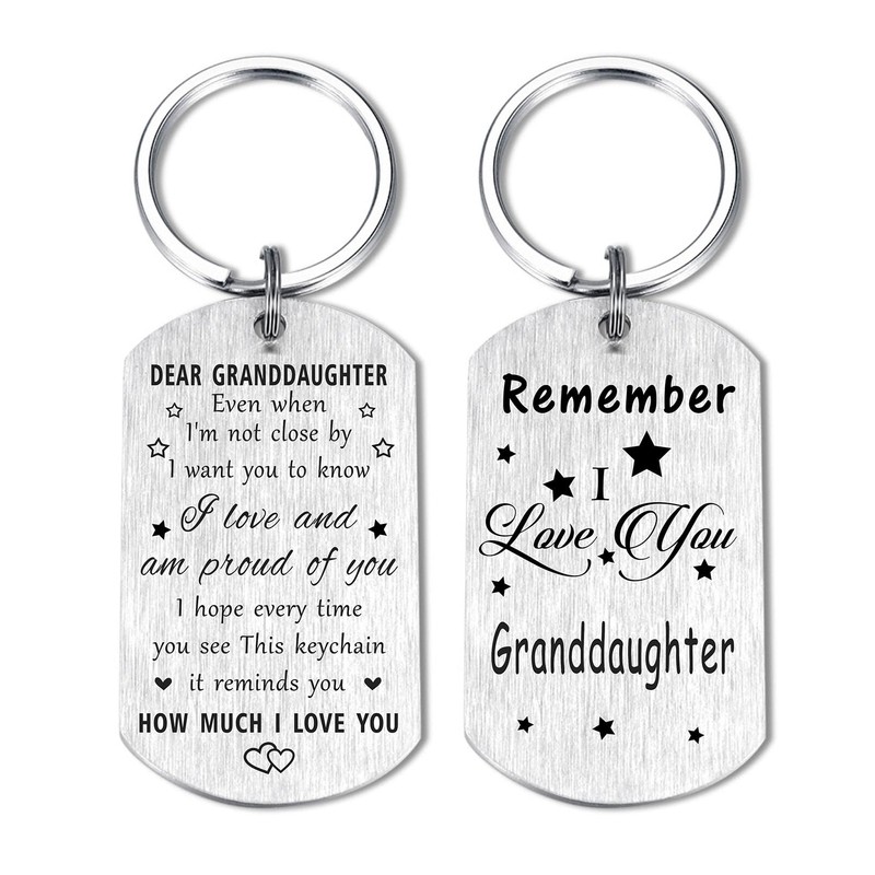 - Granddaughter Keychain Message:Front engraved "Dear Granddaughter, even when I'm not close by I want you to know I love and am proud of you.I hope every time you see this keychain it reminds you how much I love you." Back engraved "Remember I love you Granddaughter". Meaningful Gifts for Granddaughter!