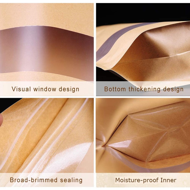 - CONVENIENT & PRACTICAL DESIGN - Make your products stand out with these brown kraft paper bags featuring a clear rectangular front window and recloseable zipper. They're fun, versatile, and lightweight, in addition to being easy to use -- just fill and zip! Thick Moisture-proof Inner can protect the food from moisture and odor, fit for long-time food preservation.