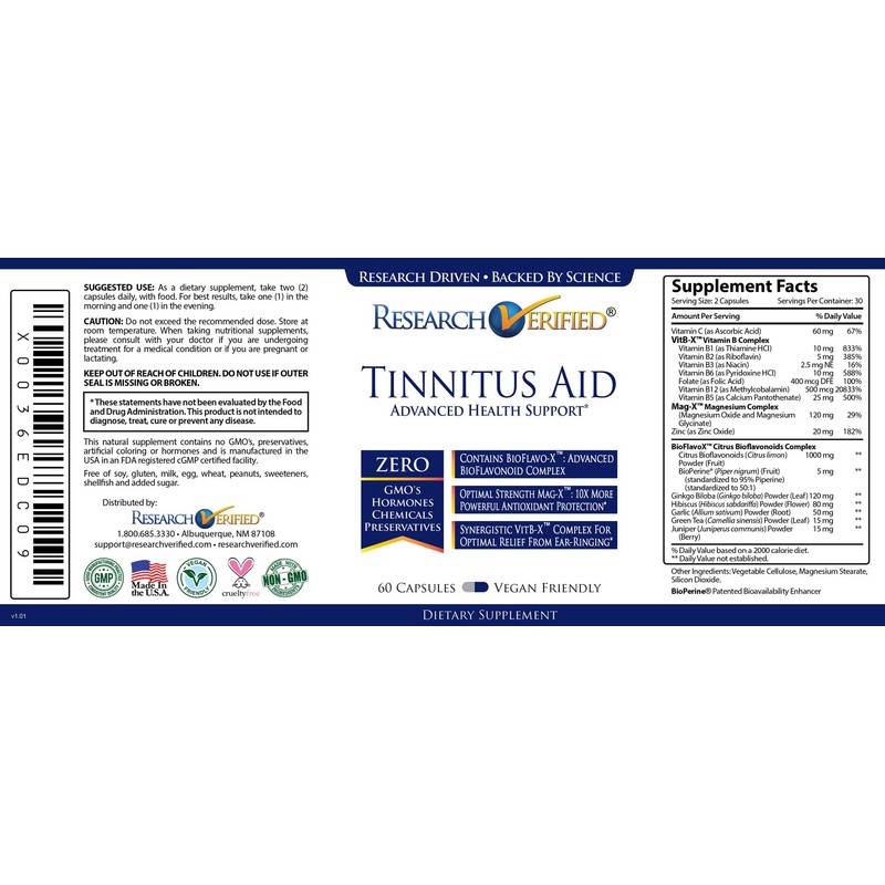 - 100% Pure - Research Verified Tinnitus Aid does not contain GMOs, preservatives, additives, or fillers. It is also vegan and made in the USA.