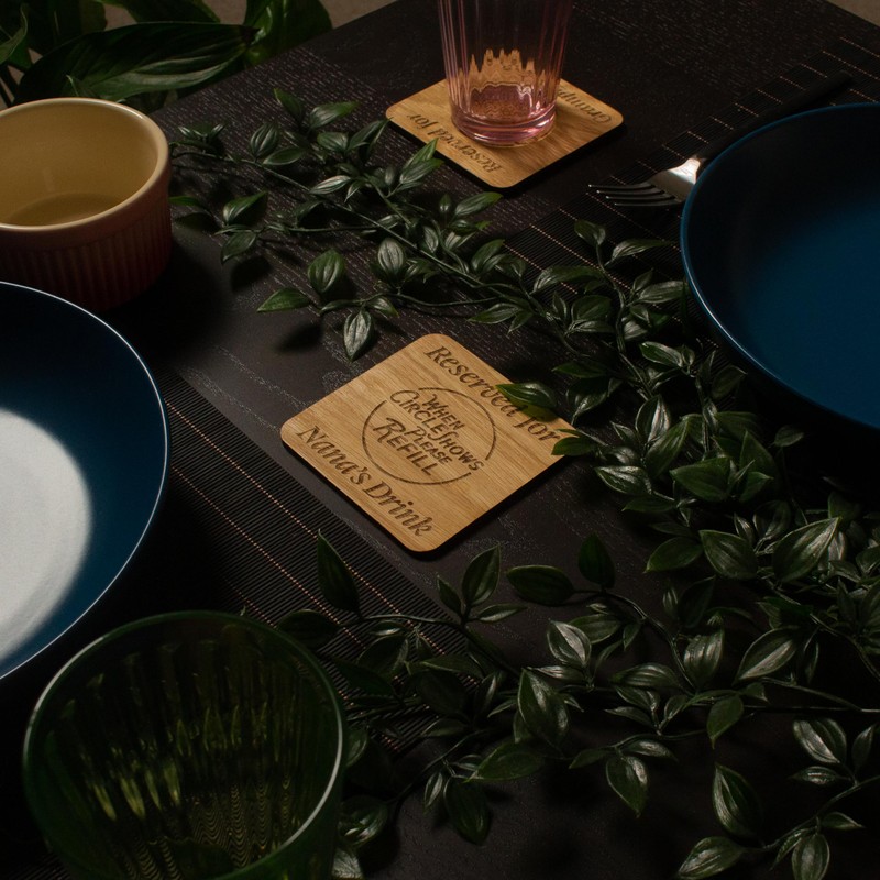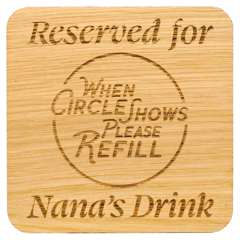 - Engraved Coaster Reads: Reserved for Nana’s Drink. When Circle Shows Please Refill.