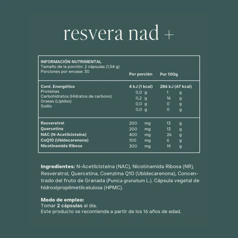 Reset Resvera NAD+ combina resveratrol, ribosa de nicotinamida y NAC para apoyar el envejecimiento saludable, la energía mitocondrial y la protección antioxidante.