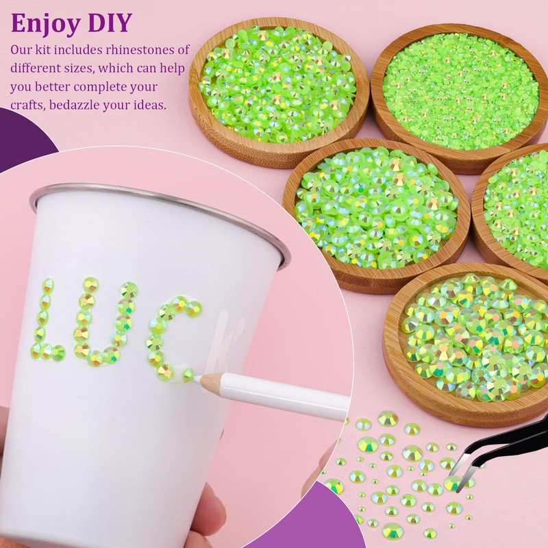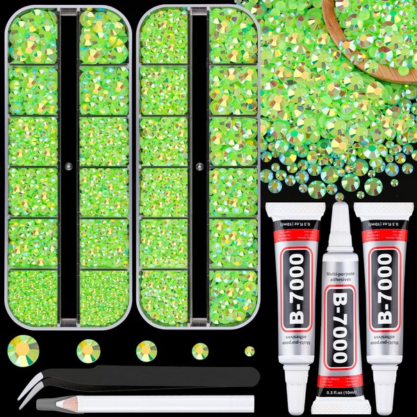 Resin Jelly Rhinestones for Crafting with B7000 Jewelry Glue, 2 Boxes Fluorescent Green AB Flatback Crystals with 3Pcs 10ml Glue, Bedazzling Non Hotfix Gems for DIY Tumblers Clothing Shoes Manicure