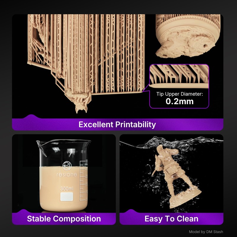 - Matt texture, Smooth surface: The printed parts feature a premium matte texture with non-translucent thin structures, making it easier to observe model details and imperfections. RESIONE recommends printing with a 0.02mm layer height, which ensures a fine and smooth surface, helping to reduce post-processing time