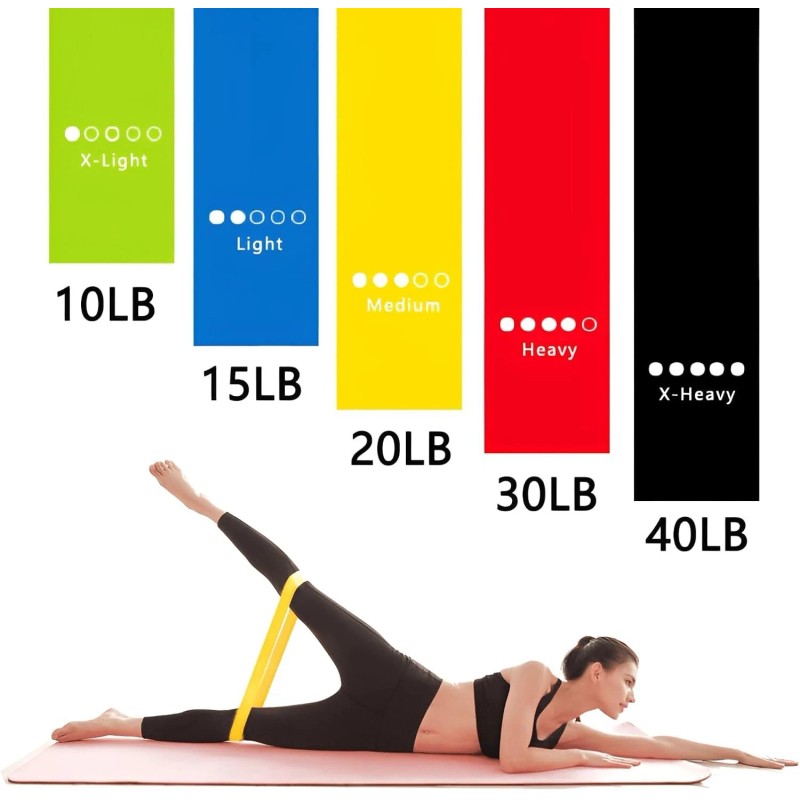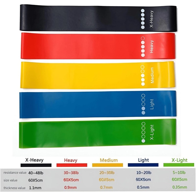 Kit includes: 5 pull-up straps, 1 carry bag and 1 exercise guide. The resistance bands are green 5-10 lbs, , blue 10-20 lbs, , yellow 20-30 lbs, , red 30-38 lbs, , and black 40-48 lbs, . Use these bands to work your arms, back, hips, legs, chest and abdomen for row, pull, lift and flight exercises.