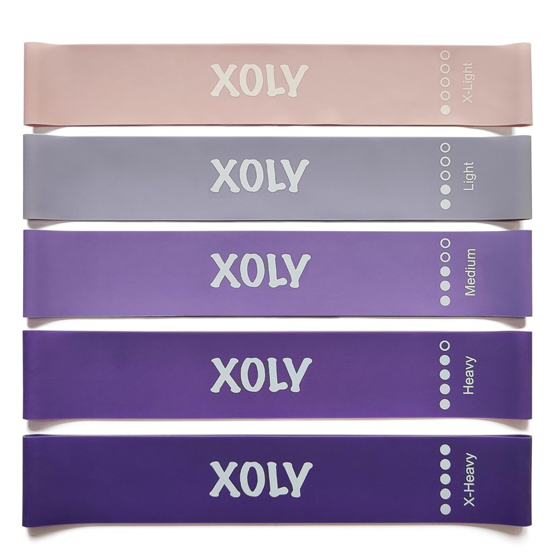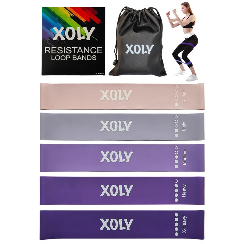 Resistance Bands By XOLY (Set of 5) Skin-Friendly Resistance Fitness Exercise Loop Bands with 5 Levels-Carrying Bag Included-Ideal for Home, Gym, Yoga, Training (Purple)